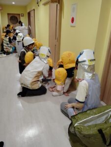 久しぶりの防災頭巾やいつもとは違う雰囲気に涙が出てしまう子もいましたが、先生と一緒に上手に避難することができていましたよ😊✨