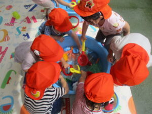 ジョウロやバケツを使って水が流れる音や飛沫を楽しんだり、服が濡れることを面白く笑ったりして楽しみました😄