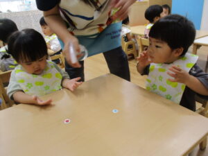 先生が「消毒するよ~。おててぱあしてね」と伝えると