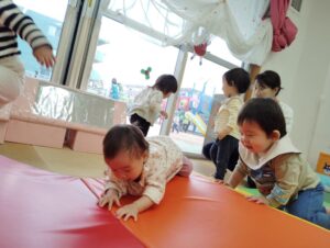 お部屋では、マットで身体をたくさん動かしてあそぶ姿もあり、