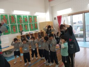 元気いっぱい「Hello!」のあいさつからレッスンが始まり、先生の名前を言ったり、「How are you?」「What’s your name?」の質問に答えたりと、これまでに覚えた英語を自信をもって話す姿がたくさん見られました。最近では、お友だち同士で質問し合う姿も増え、やり取りを楽しんでいます。