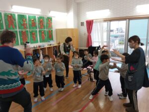 今日はクリスマス前のレッスンということもあり、サンタクロースが登場する楽しい歌に合わせてダンスをしたり、英語の絵本を読んでもらったりしました。「Yes, I do!」「No, I don’t!」と元気に答えながら、最後まで笑顔で参加していました。