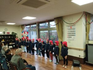 今日は、世代間交流の一環として近隣の老人ホームへ年長児が訪問してきました。