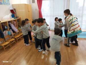 おこなったのは「木こりとリス」のゲーム。「オオカミが来たぞ〜!」の合図で、リスたちは大急ぎで別のマイホームへお引越し!