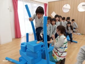 公園の遊具をイメージしたコースを自分たちで作り、子どもたちは大興奮。全身を使ってダイナミックに体を動かし、お部屋中がキラキラした笑顔でいっぱいになりました。