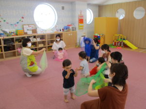 色の英語を教えてもらい一人ひとりに同じ色のシフォン布を渡すと、上下にひらひらさせたり頭からかぶったりして楽しんでいましたよ。