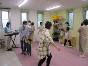 ♪どんぐりころころ♪では、どんぐりの泣いたり笑ったりする表情をみんなでまねっこしてあそびました。