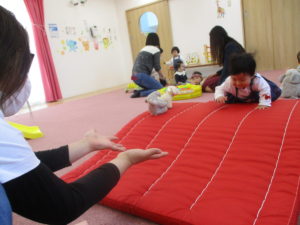 ボールプールのボールで遊んだり、ママがマットの反対側で待っているとお山をがんばって登ったり、体もたくさん動かして遊んでいましたよ(^^)