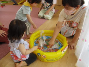 ボールプールやお魚釣り、水の入ったビニール袋の中のお花紙をさわったりして、いつもと少し違った遊びもしましたよ。