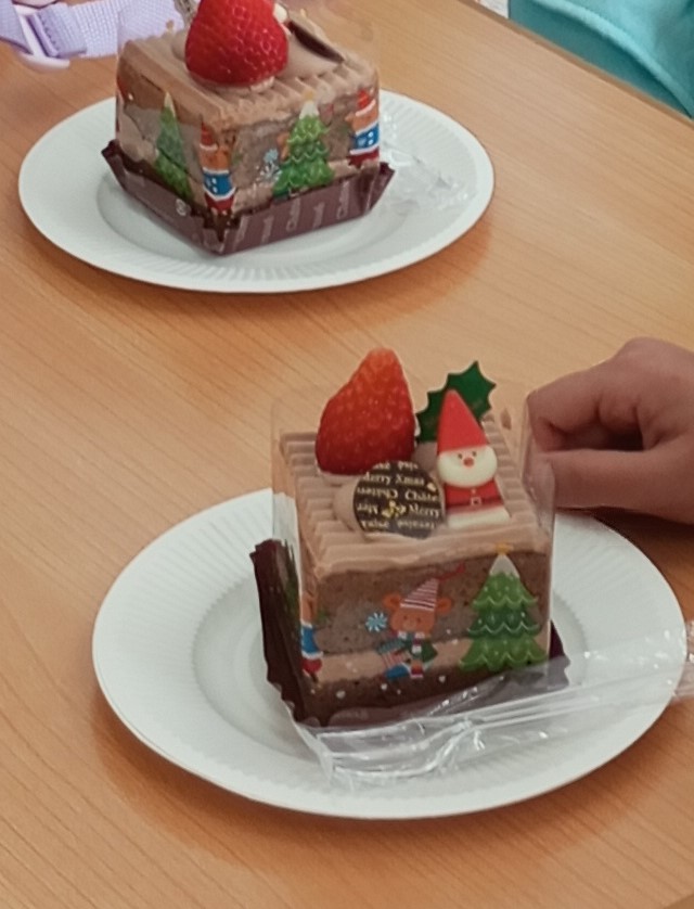 たくさん遊んだ後は、サンタさんが飾られたかわいいケーキをみんなで食べました(⌒∇⌒).