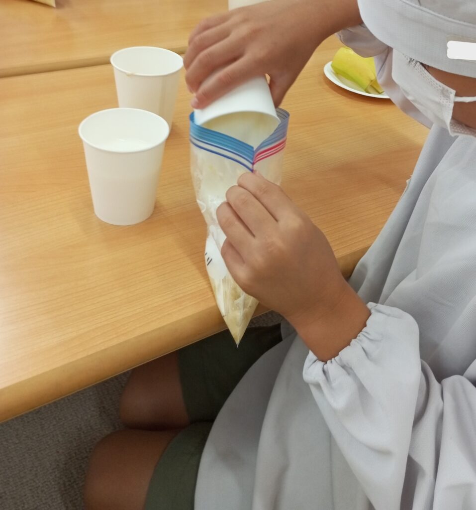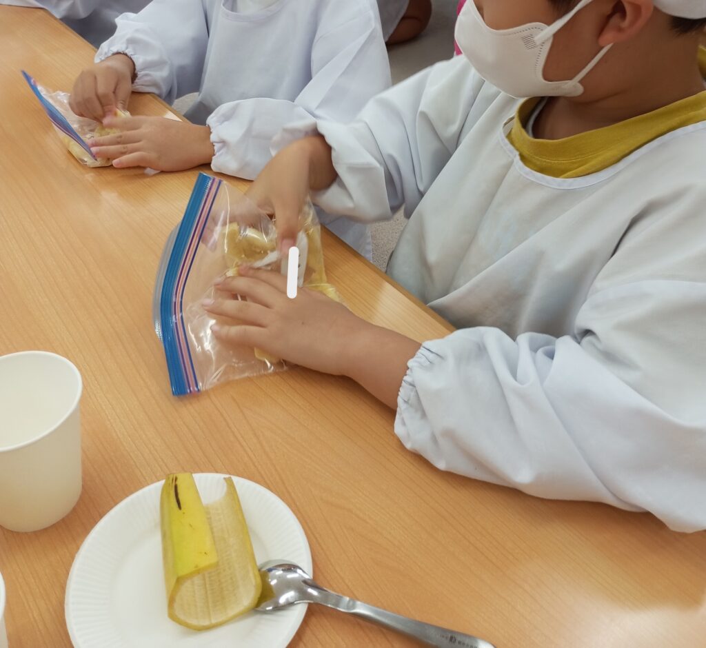 バナナをつぶして、牛乳、ヨーグルト、砂糖を混ぜて作っていきます。