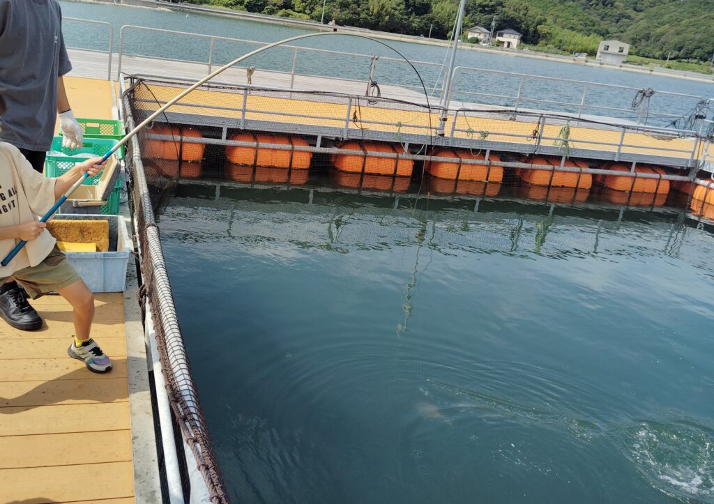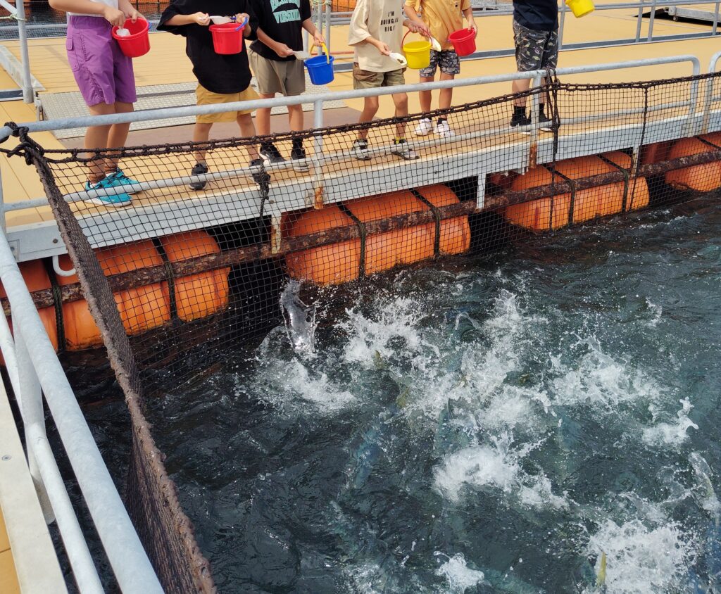 ハマチのえさやりでえさを勢いよく食べるハマチの姿に大笑いしたり、「ハマチって鱗あるんかなあ?」や「この中何匹おるんやろ~?」と