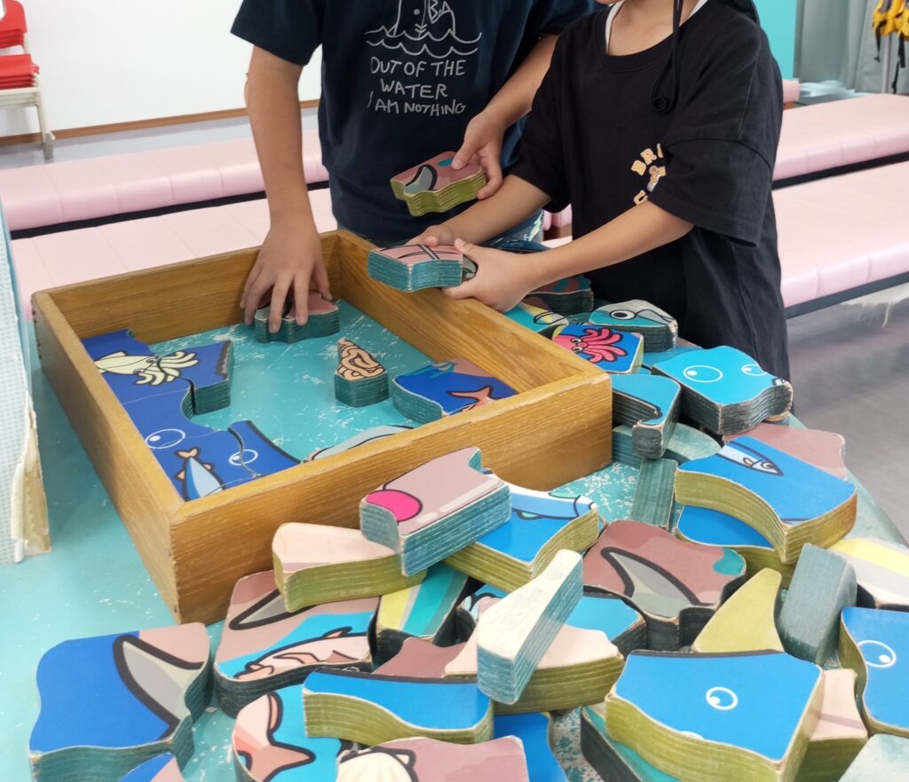 3層になっている難しい魚のパズルを協力して楽しんでいました.。o○