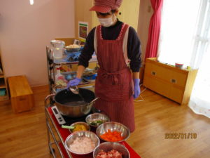 目の前で調理する様子を見たり匂ったりすることは、食べ物に興味を持ったり調理することに関心を持つことに繋がります。