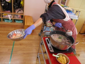 今日は多肥下町園のきりん組さんで、香川県の郷土料理「打ち込みうどん」を作る様子を見学してもらいました。(新型コロナ対策により内容を変更しています。)