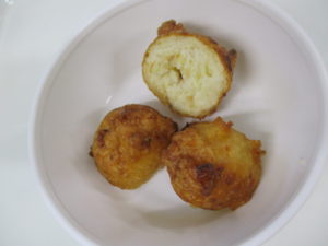 豆ドーナツの大豆は細かく刻み、ホットケーキミックスに加えて油で揚げます。