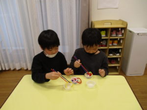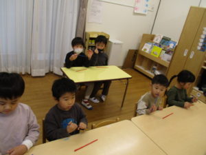 子どもたちに赤と青の色を付けた割り箸を渡しました。