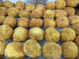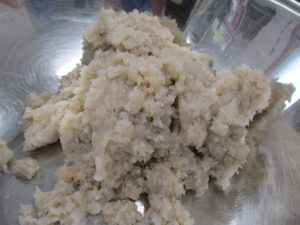 ④形を整えて小麦粉、卵、パン粉の順につけて揚げる。