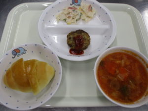 《バターロールパン、ハンバーグ、ミネストローネ、れんこんの梅マヨサラダ》でした✨パンやハンバーグなど子どもたちの大好きなものがつまった素敵な献立になりました☺