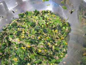 ②小松菜を2cmに切って茹でる。