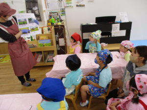 手をしっかり洗い、席についたら、おにぎり作りの前にお米はどうやって作られるのかお話を聞きました。