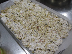 ④クッキングシートを敷いたバットに薄く広げていきます。くっつかないように少量のサラダ油を塗りながら広げていくときれいに広げることが出来ます。