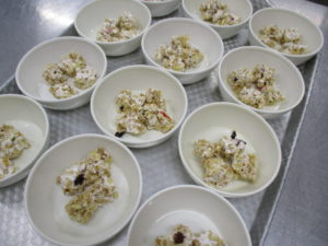 ①マシュマロとグラノーラをそれぞれ用意します。※グラノーラを入れるボールにはくっつき防止のため薄くサラダ油を塗っておきます。