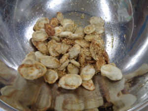 ごまと、砂糖・しょうゆ(保育園では砂糖としょうゆを混ぜ、加熱して少し煮立たせています)をごぼうに混ぜ合わせます。