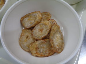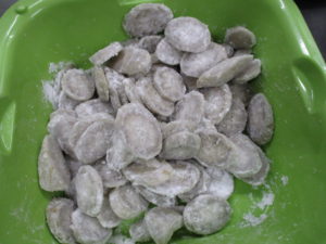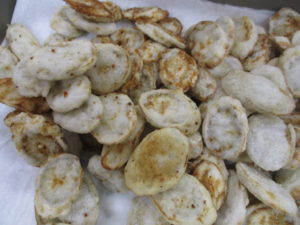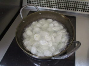 薄めに片栗粉をまぶして、油で揚げていきます。