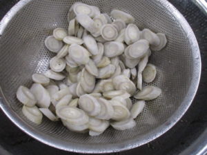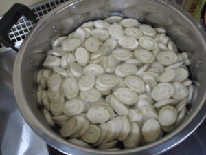 たっぷりの水で茹でていきます。柔らかくなったら、ざるにとって水気を切ります。