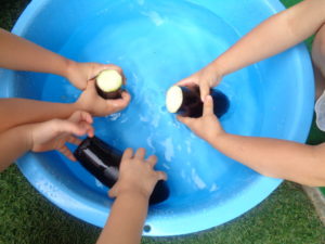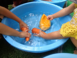 むいてくれたお野菜を水でゴシゴシ洗います!