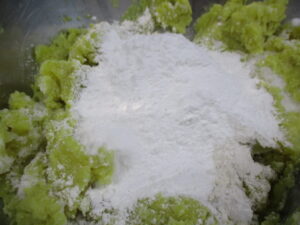 さつまいもに、豆乳、米粉、砂糖、バニラエッセンスを加えてよく混ぜる。
