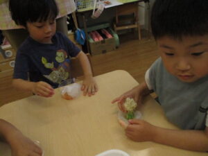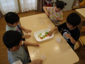 「根っこが下だよ」と言うと、よ~く野菜を見て入れていました(*^-^*)