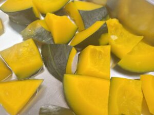 ①かぼちゃはやわらかく蒸して熱いうちに潰す