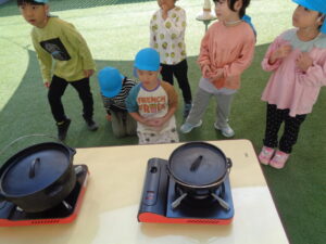 年長さんと年中さんは、給食の先生と一緒に石焼き芋作りにチャレンジしました🍠