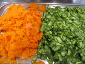 ② きゅうり、にんじん、ハムを食べやすい大きさに切る。