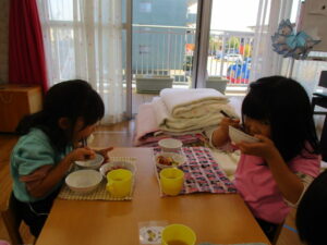 サラダがカラフルだったので、「信号機みたいだね」「いろんな色があるね」と子どもたちならではの感性で、給食の時間を楽しんでいました♪おかわりもして、たくさん食べてくれました☺
