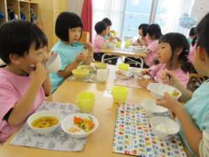 今日の給食はポテトサラダの他に、海老カツ、かぼちゃのスープでした。海老カツも子どもたちに大人気であっという間に食べ終わっていました!