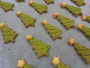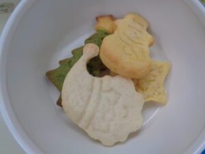 クッキー生地を抹茶やかぼちゃで色付けし、ツリーやサンタさん、雪の結晶、雪だるまの型抜きをしました◎