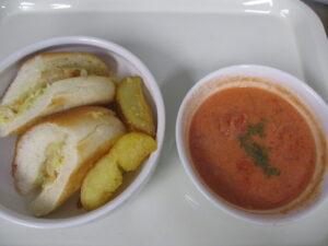サブマリンサンドイッチ、クリーミートマトスープ、フライドポテトでした。細長いロールパンにキャベツとにんじんをマヨネーズで和えたものと、カレー粉で味付けした鶏肉をはさんでいます。スープには牛乳が入っていて、いつものトマトスープとは違いまろやかなスープになりました。