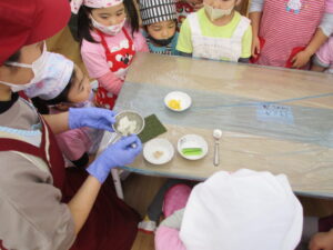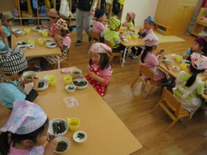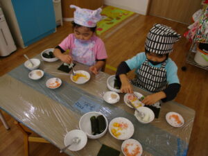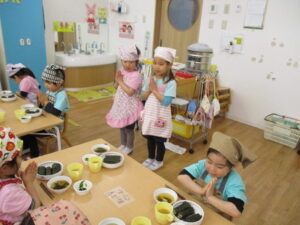 今日、多肥下町園のきりん組さんは、クッキングで手巻き寿司を作りました。