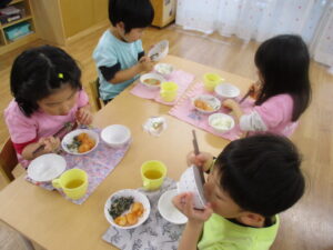 今日はぱんだ組さん、先日の19日にはらいおん組さんでも保護者の方々にお集まりいただき、給食試食会を行いました。お忙しい中、ご参加いただきありがとうございました。