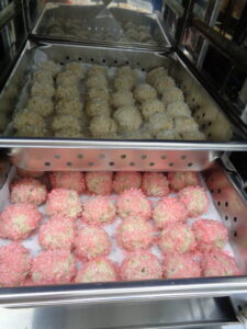 もち米蒸しだんごは、赤の色素にもち米を浸してピンク色に色付けしました◎