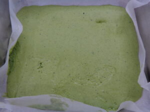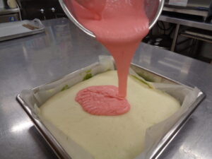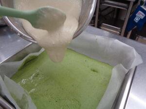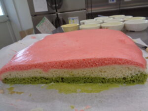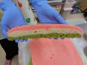まずは緑の生地を流しいれ、少し加熱し、次は白い生地を入れ、また少し加熱し、最後にピンク色の生地を流しいれて、しっかりと加熱しました(^o^)丿