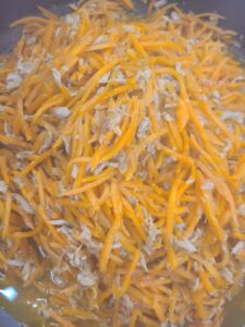 もう一品は人参しりしりです。細切りにした人参をゴマ油で炒め、ツナを加えて、しょうゆで味付け