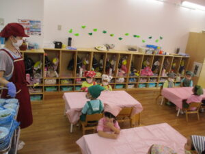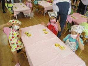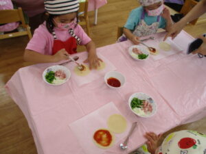 今日、多肥下町園のきりん組さんは、クッキングで具たくさんのピザを作りました。