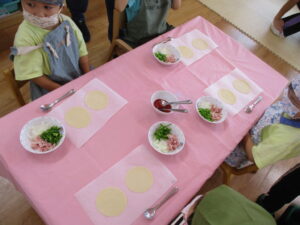 今日はみんなピザ職人になって、餃子の皮にケチャップを塗り、具材をトッピングしてもらいます。