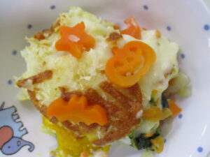かぼちゃのグラタンには、ジャックオーランタン、がいこつ、こうもり、お化けのお城、星型の人参を飾りました。