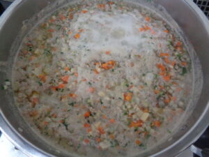 火が通ったらきゅうり以外の野菜を加えて炒め、水を加えやわらかく煮ていきます。
