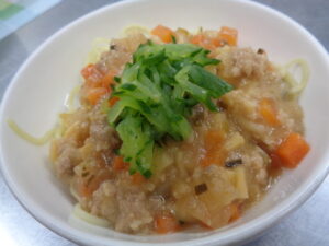 給食のジャージャー麺には豚ひき肉、人参、玉ねぎ、たけのこ、きゅうり、ねぎ、など